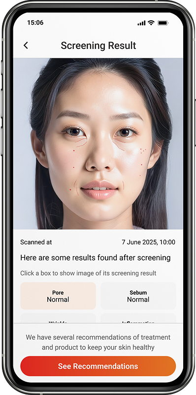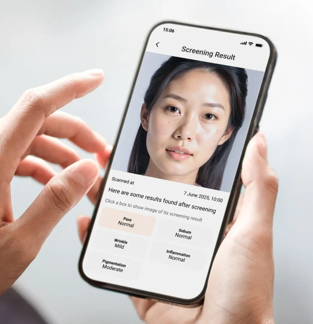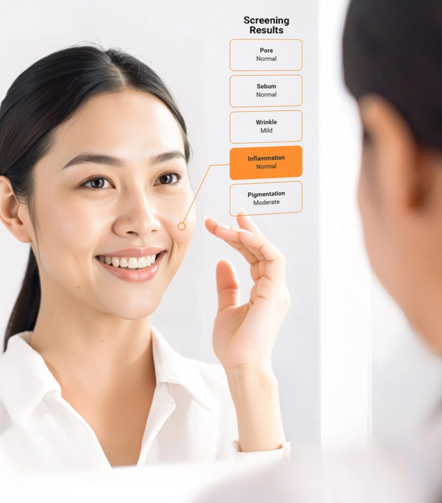 Magic Mirror is used as an initial skin review, providing you with a skin analysis of your skin’s condition. It evaluates key aspects such as pores, sebum, wrinkles, inflammation and pigmentation. It’s a great way to get started on understanding your skin’s needs by consulting a skincare professional or dermatologist.